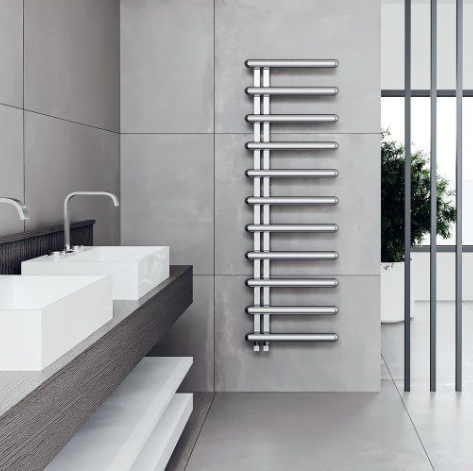 Suggest a space that prioritises both comfort and style. This wall mounted designer towel radiator has a minimalist aesthetic with elongated, cylindrical bars arranged vertically. Each bar is spaced evenly, creating a rhythmic pattern that enhances the balanced, visual appeal of the design.