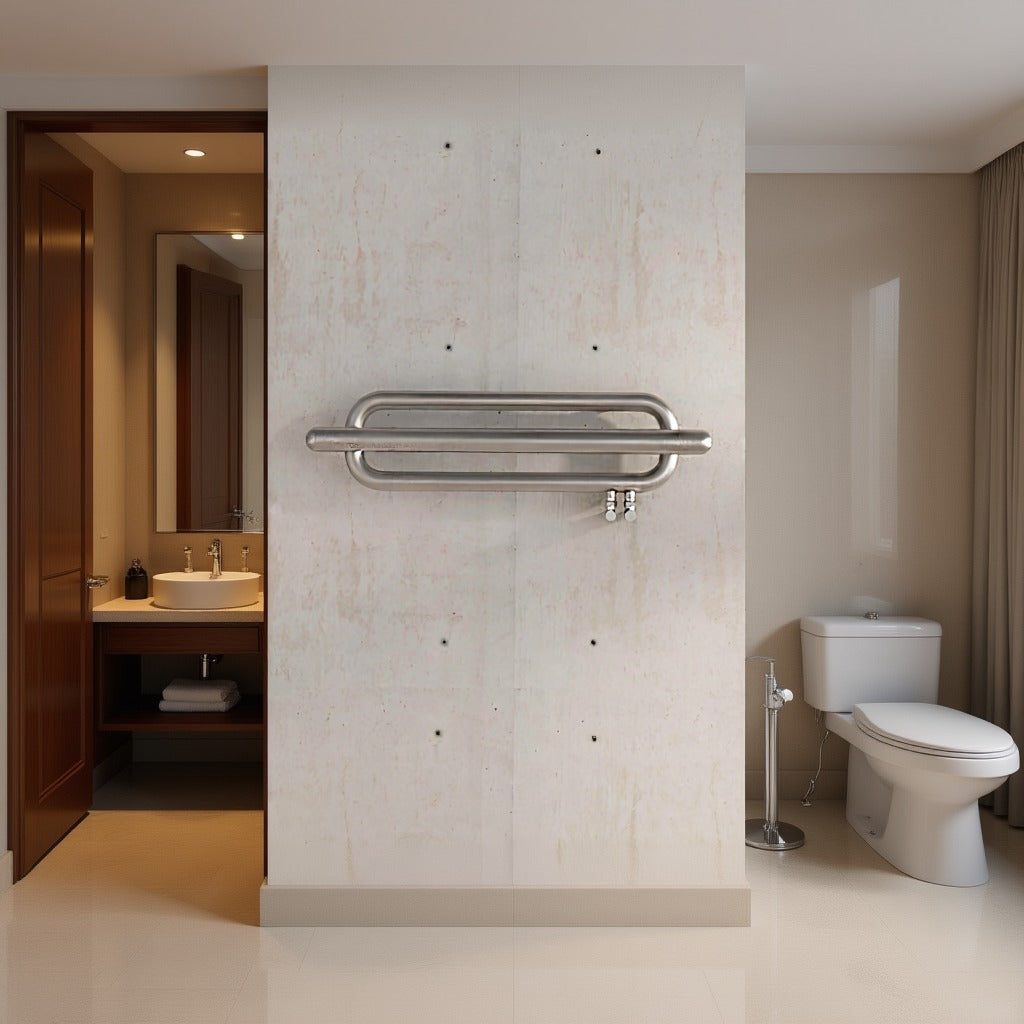A single sweep of horizontal stainless steel, the Swing model by quality brand Carisa is a designer towel radiator that slips neatly beneath windows or across the end of a bath, warming both room and towels without crowding your walls. At just 250 mm high and 1000 mm wide, it has a deceptively low profile yet the solid stainless-steel tube carries plenty of heat for compact bathrooms and cloakrooms. Choose Mirror Polish for a crisp, reflective gleam or Satin Polish for a softer, brushed sheen—both finishes stand up to humidity and daily splashes with effortless grace. Carisa underwrites that durability with a 20-year warranty, so you can enjoy reliable, sculptural warmth season after season