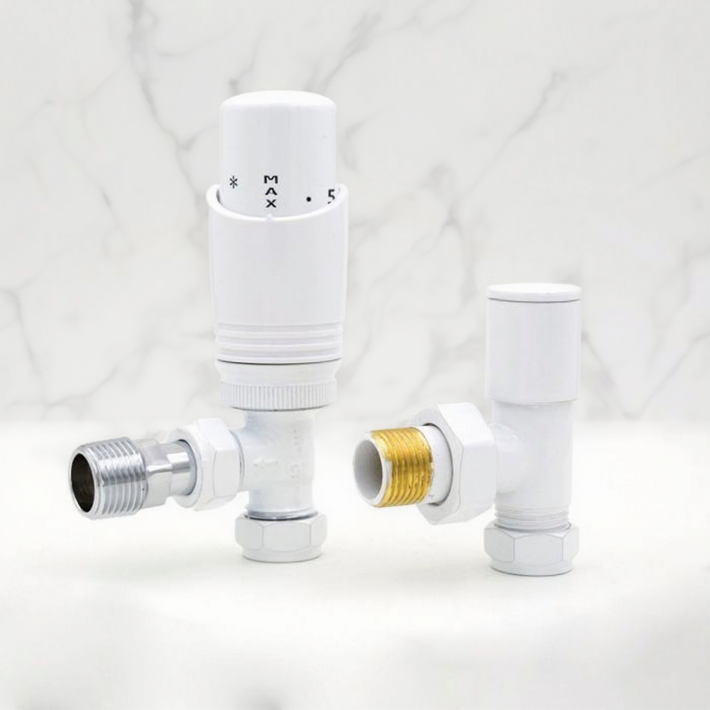 The Eucotherm Deluxe TRV Valve Set – Angled, White combines a precision thermostatic radiator valve with a matching lockshield so you can dial in the perfect temperature for each room while keeping pipework neat; crafted from solid brass and coated in a crisp RAL 9016 white, it fits any hot-water radiator or towel rail with standard 15 mm compression connections, including the entire Eucotherm designer range, and arrives with a two-year manufacturer’s guarantee for extra peace of mind. The liquid-filled sensor modulates flow between frost-protection and 27°C set points to stop energy waste—field studies show thermostatic valves can cut real-world heating demand by roughly 3% —while the angled, bi-directional body tucks neatly under wall-fed radiators, making installation fast and the finished look effortlessly streamlined.