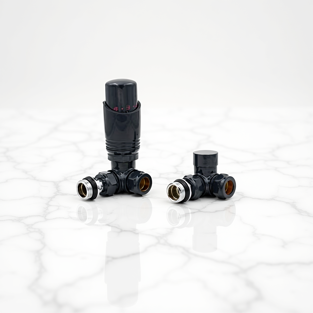 This valve set in anthracite by designer brand Eucotherm gives wall-fed radiators a clean, streamlined look while letting you fine-tune the heat in every room: the corner bodies tuck pipework tight to the wall for easier cleaning and a neater finish, the thermostatic head and matching lockshield drop straight onto standard 15 mm compression × ½″ BSP connections so they’ll work with almost any hot-water radiator, not just Eucotherm models, and the numbered dial automatically holds your chosen temperature—tests for BEAMA show valves like these can cut heating energy use by roughly 18% across a UK season. A tough RAL 7016 anthracite powder coat resists knocks, moisture and UV fade for years of everyday use, and the set arrives as a ready-matched pair with a reassuring two-year manufacturer’s guarantee.