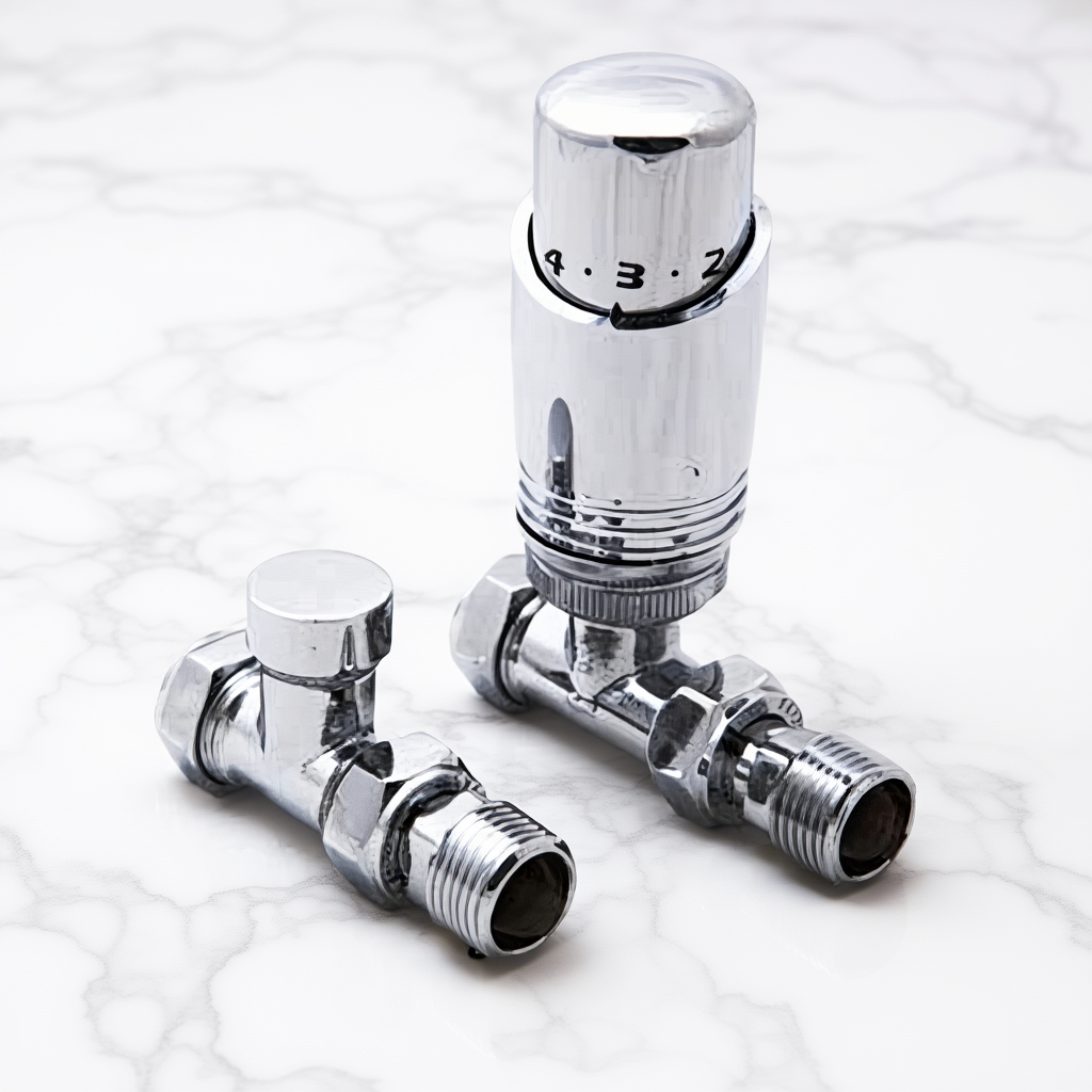 Bring effortless comfort and a little extra shine to your heating set-up with the Eucotherm Deluxe Thermostatic Valve Set – Straight Chrome. This two-piece kit (thermostatic head + matching lockshield) slots straight onto standard 15 mm floor-fed pipes, making installation quick for almost any hot-water radiator—no special adapters, no fuss. Once fitted, you simply twist the numbered cap to pick your preferred warmth; the valve then opens or closes automatically to hold that temperature and guard against frost. Independent tests for BEAMA found that thermostatic valves like these can trim heating energy by around 18% over a typical UK season, so you stay cosy while keeping bills in check. A mirror-bright chrome finish blends neatly with taps and towel rails, the build is designed for everyday durability, and Eucotherm rounds it all off with a two-year guarantee for peace of mind.